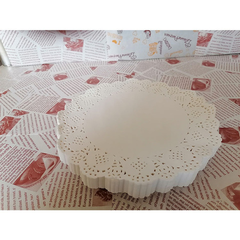 Personalizado descartável Greaseproof 53gsm Papel Doily Food Grade Branco Papel Redondo Lace Dollies Placemat